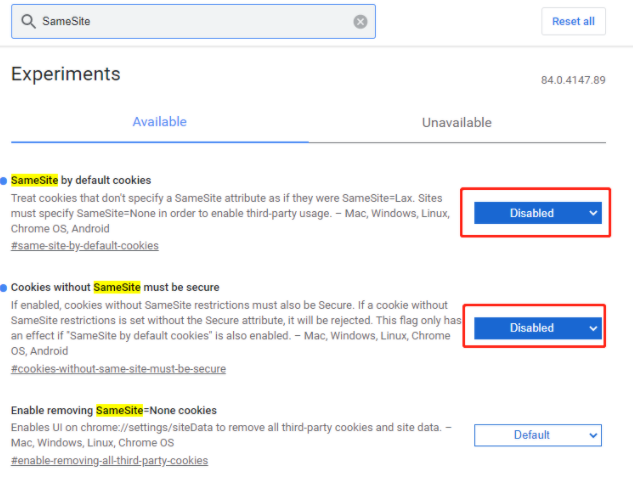 搜索“SameSite“,修改配置项如图,注意:设置好必须重启浏览器