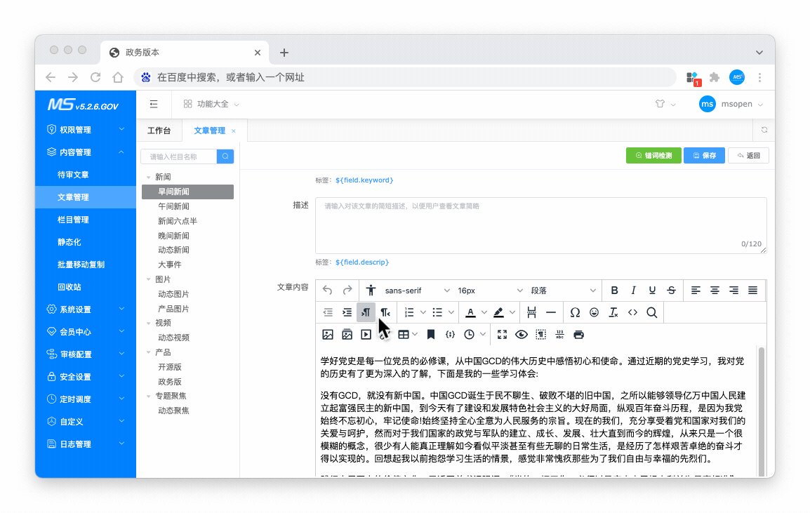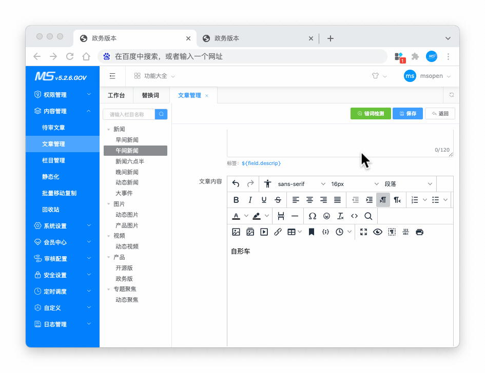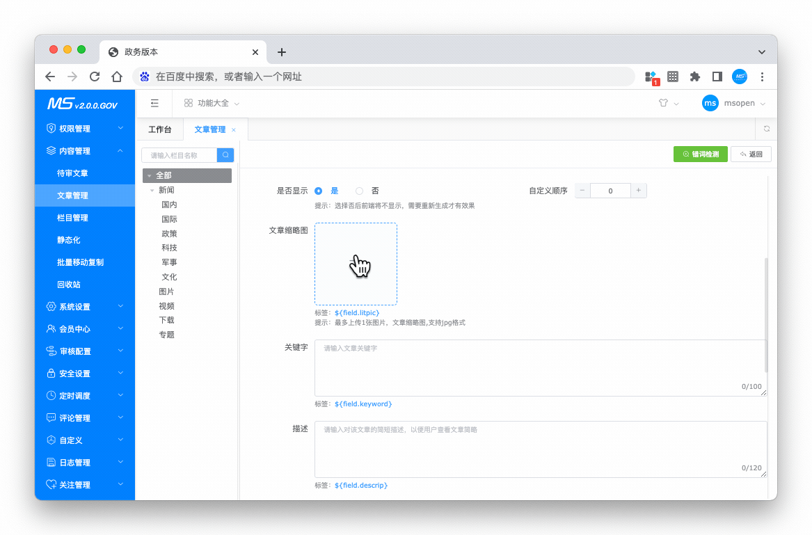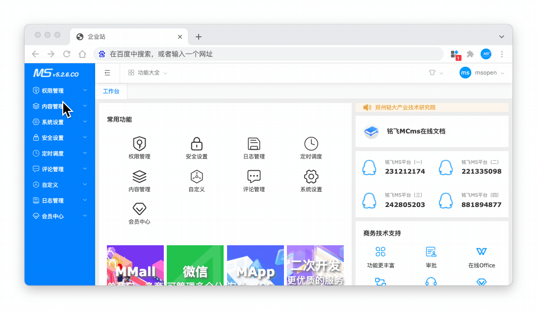 MCms内容插件提供最基本的菜单、权限、角色、栏目、内容、静态化、等常用的功能,能够帮助企业或个人进行快速建站。