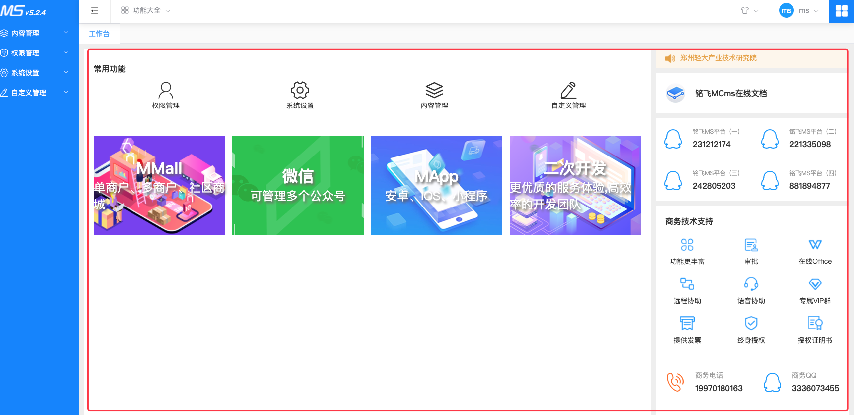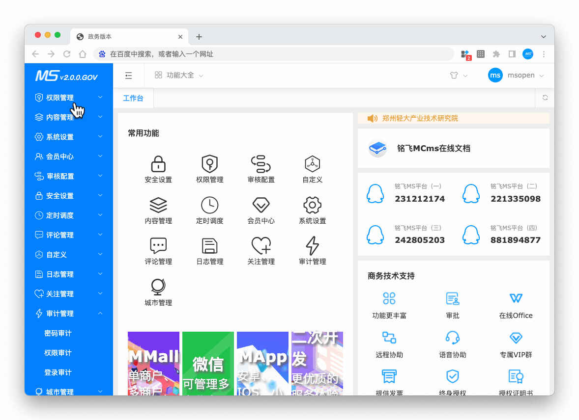 - 支持等保(只负责MCms自身的等保技术支持,数据库、服务器、网络等保不提供支持,需要联系对应供应商);