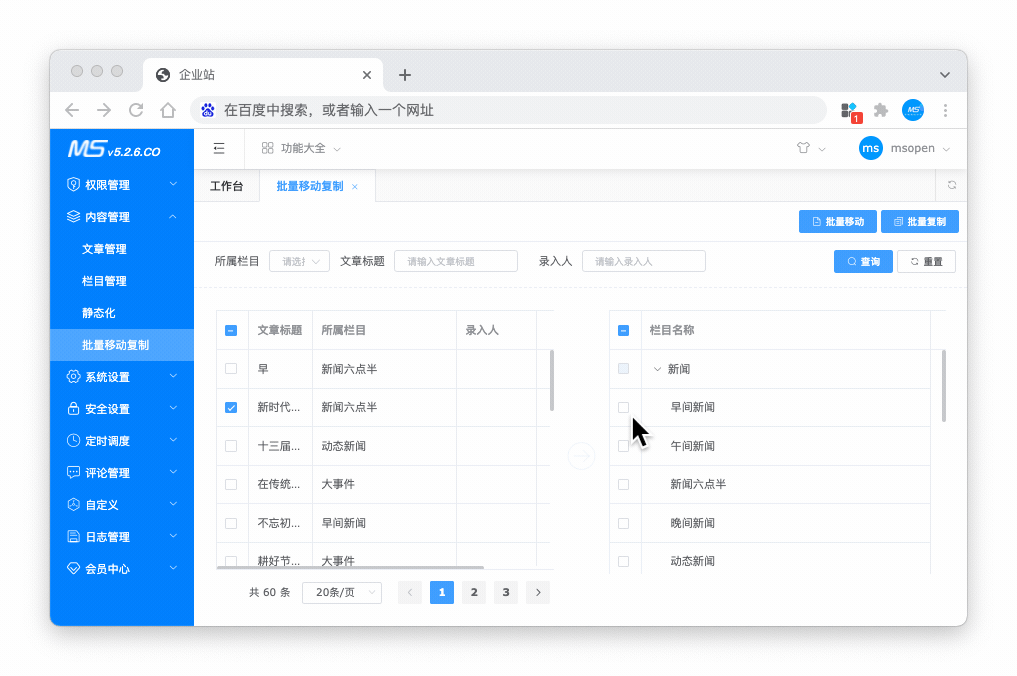 可以批量移动或复制文章到目标栏目下