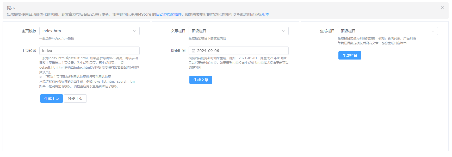 首次MCms安装部署好或启动好后,先登录后台,生成静态页面,这样才能正常访问前端地址,否则前端演示页面会提示404错误。修改模板或对文章内容进行修改后,必须进行更新操作