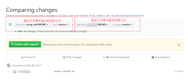 提交代码时,将开源代码作为目标分支,将自己的代码作为源分支。然后发起申请合并。