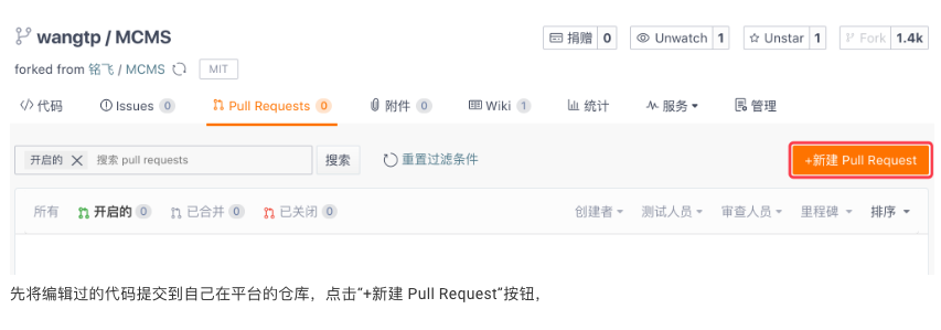 先将编辑过的代码提交到自己在平台的仓库,点击“+新建 Pull Request”按钮,