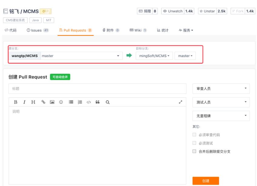 注意源分支与目标分支选择,目标分支一般为铭飞项目仓库的主分支。输入说明后点击创建按钮,然后就静静等待铭飞团队 merge 邮件通知了。