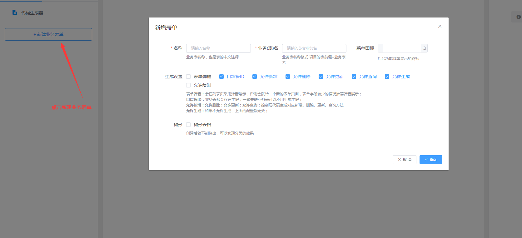- 业务表名:对应创建的数据库表名称