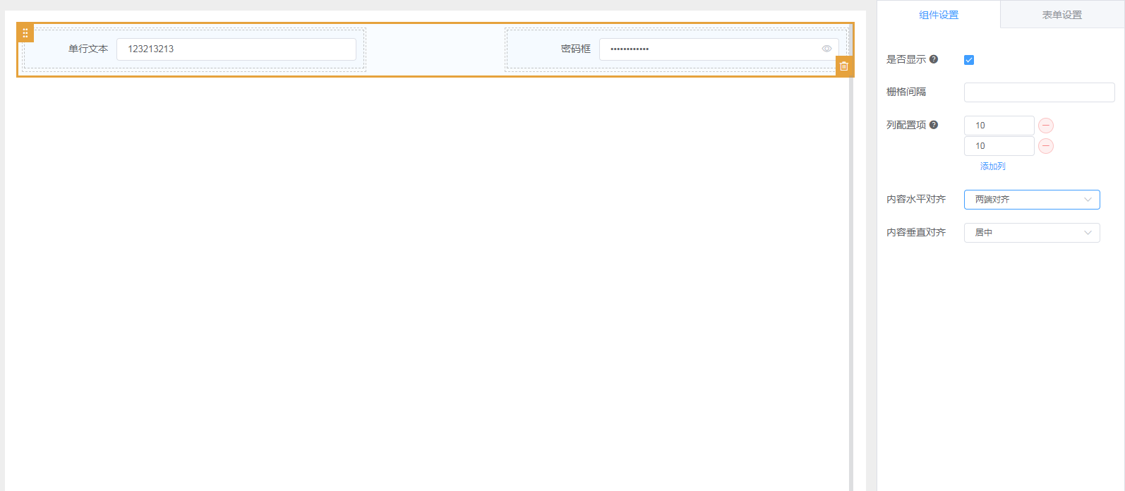 • 列配置项:总数为24,几个列配置就能放入几个组件