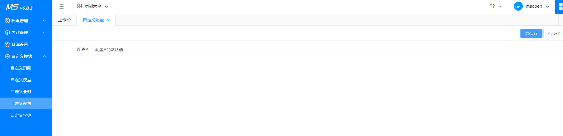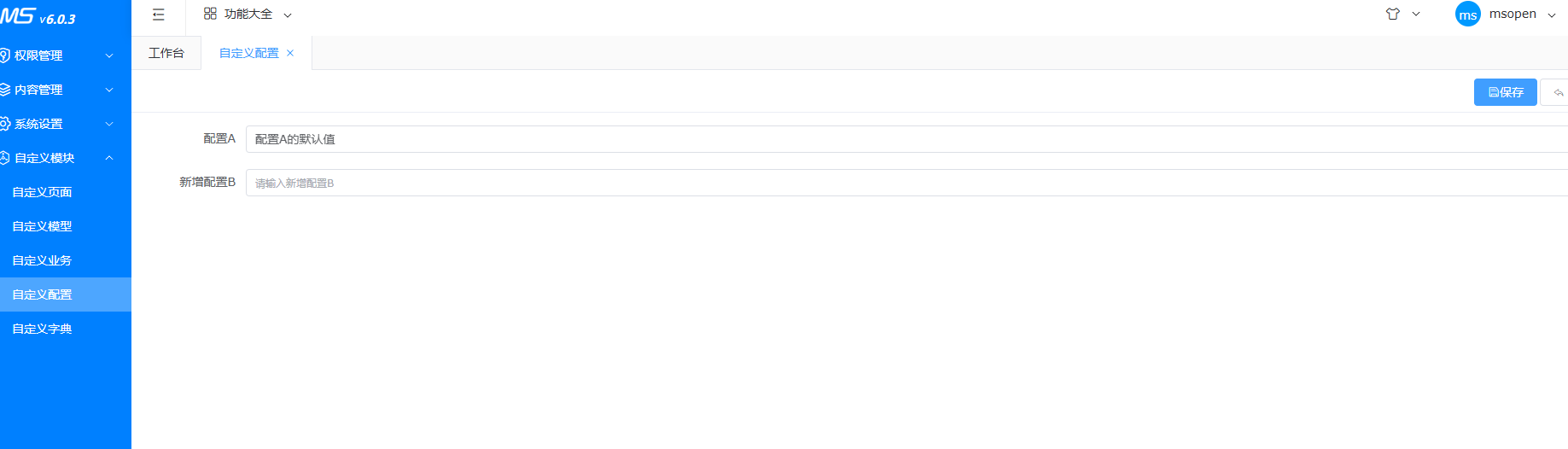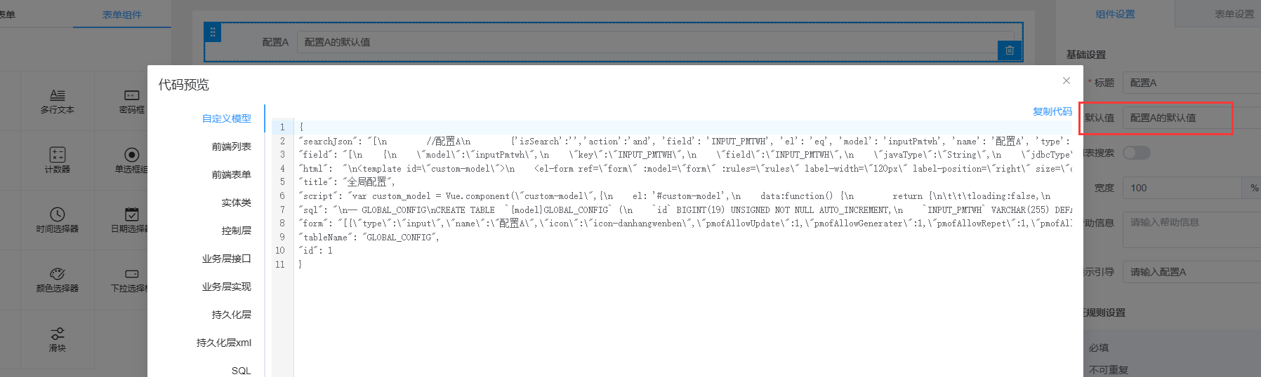 导入新配置模型时,表单会按照代码生成器中表单项设计的默认值去填写,点击保存即可按照表单填写的默认值去保存